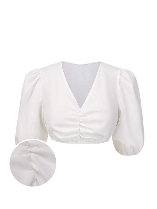 [Pre-Sale] White 1950s Ruched V-Neck Puff Sleeve Crop Top