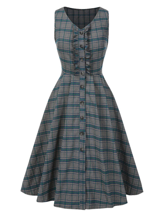 [Pre-Sale] Gray 1950s Plaid V-Neck Sleeveless Ruffled Dress