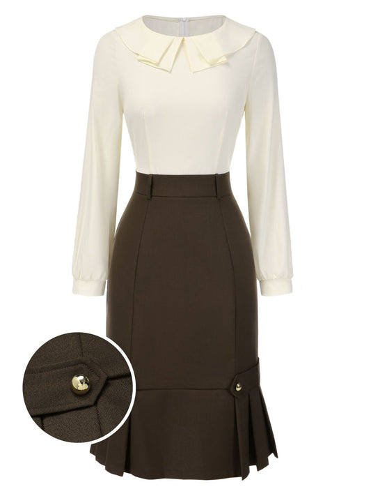 [Pre-Sale] Brown 1960s Contrast Collar Long Sleeve Pencil Dress