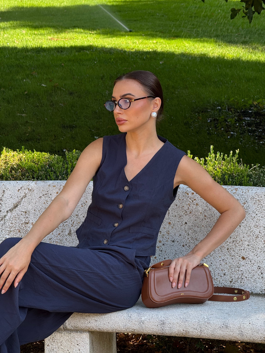 2PCS Dark Blue 1960s Solid Sleeveless Blazer Suit