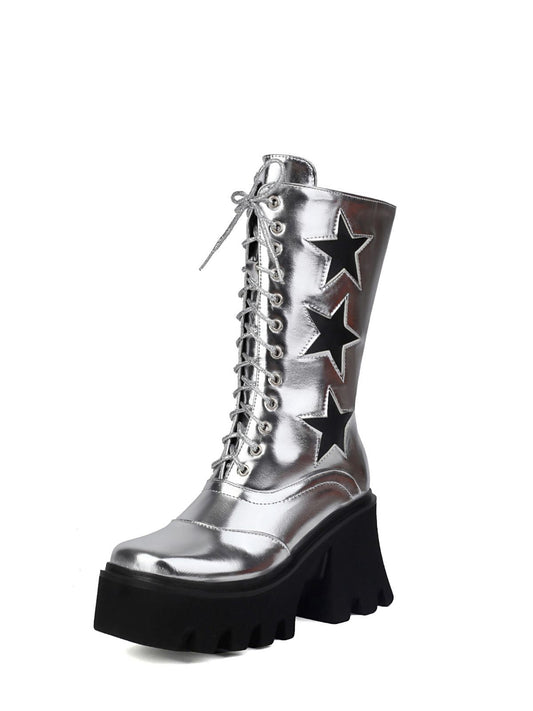 Vintage Steampunk Star Print Platform Mid-Calf Boots