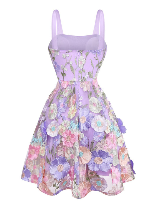 Purple 1950s Floral Embroidered Mesh A-Line Dress