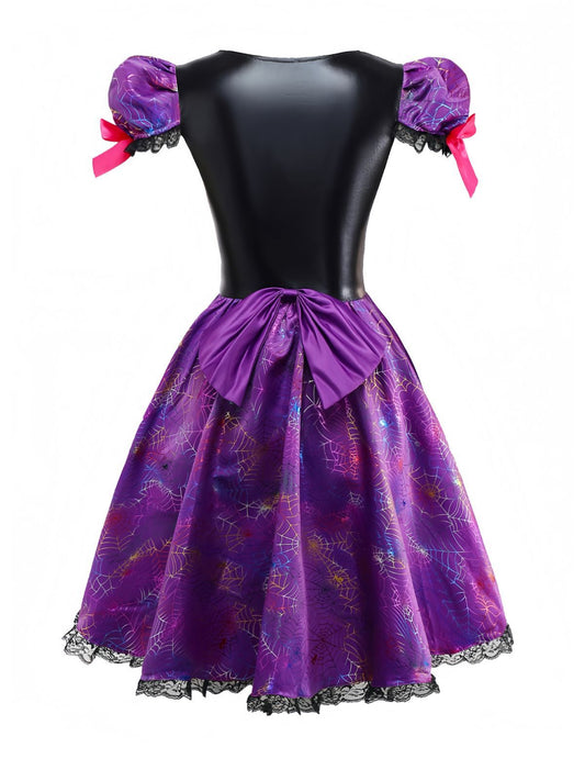 Purple 1970s Halloween Spider Web Witch Lace-Up Dress With Hat
