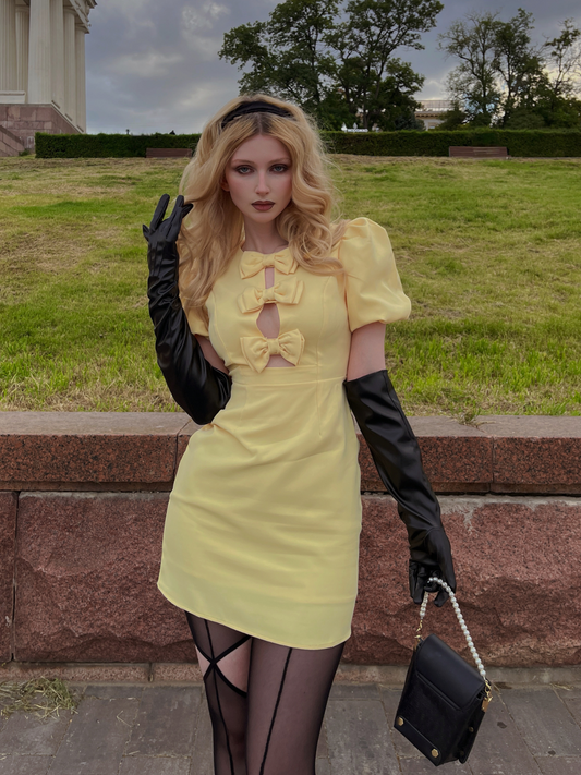 Yellow 1960s Bow Puff Sleeve Solid Dress