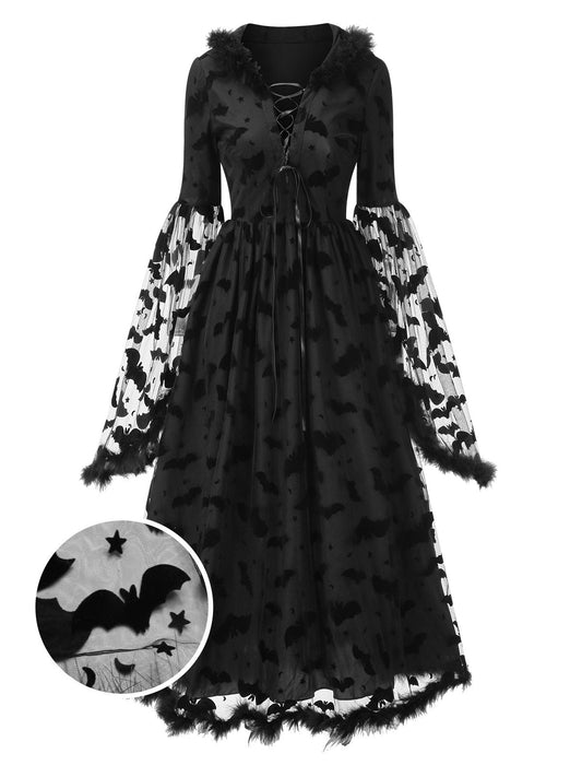 [Pre-Sale] Black 1940s Bat Mesh Raw Hem Witch Cape Dress