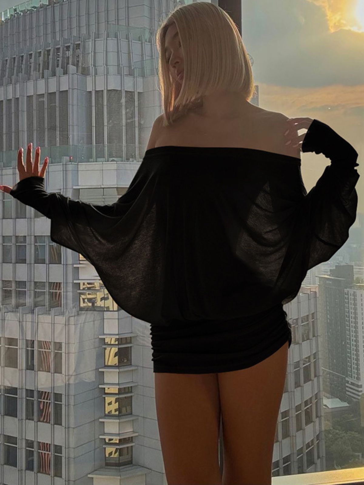 1960s Off Shoulder Ruched Batwing Mini Dress
