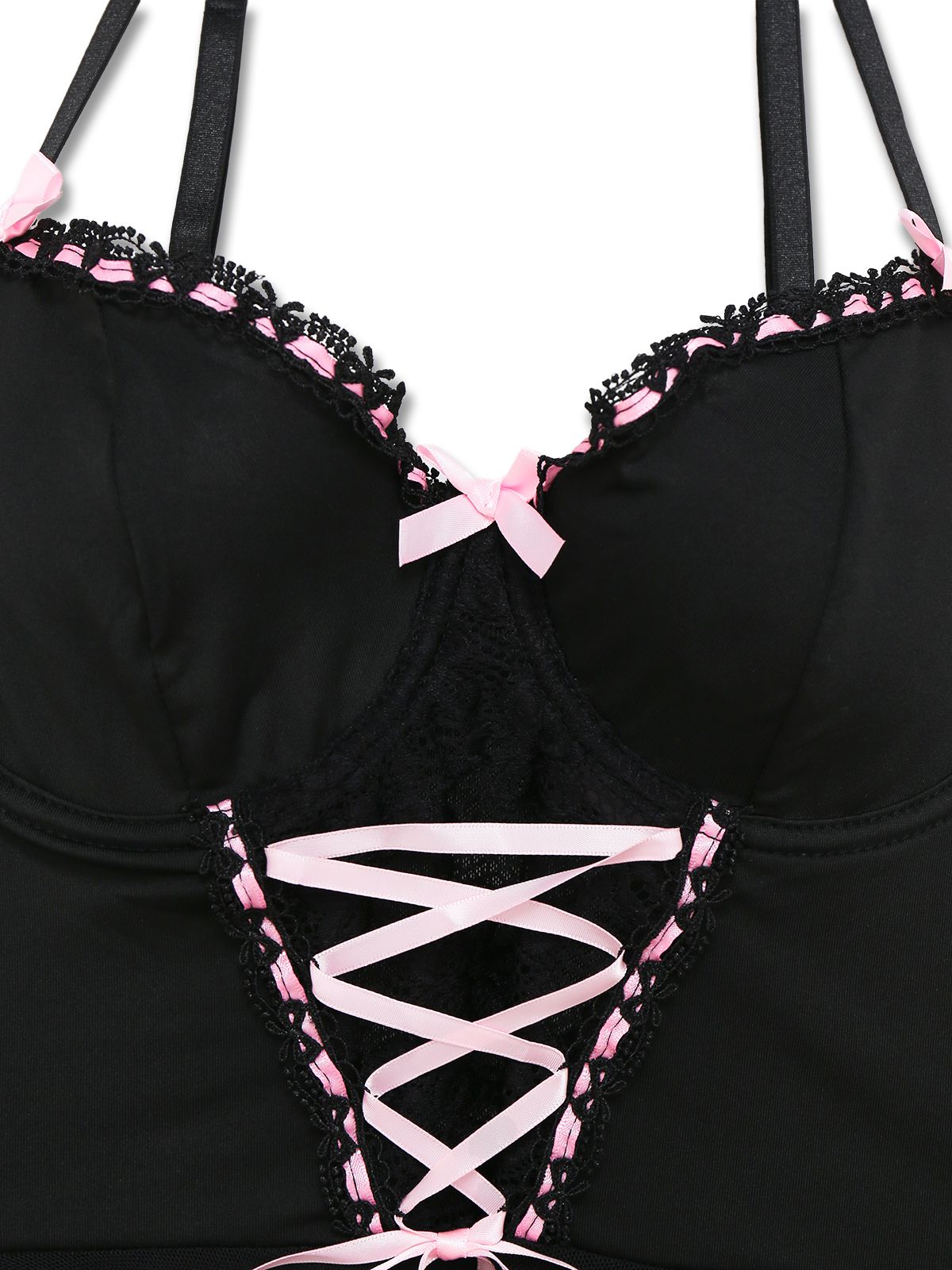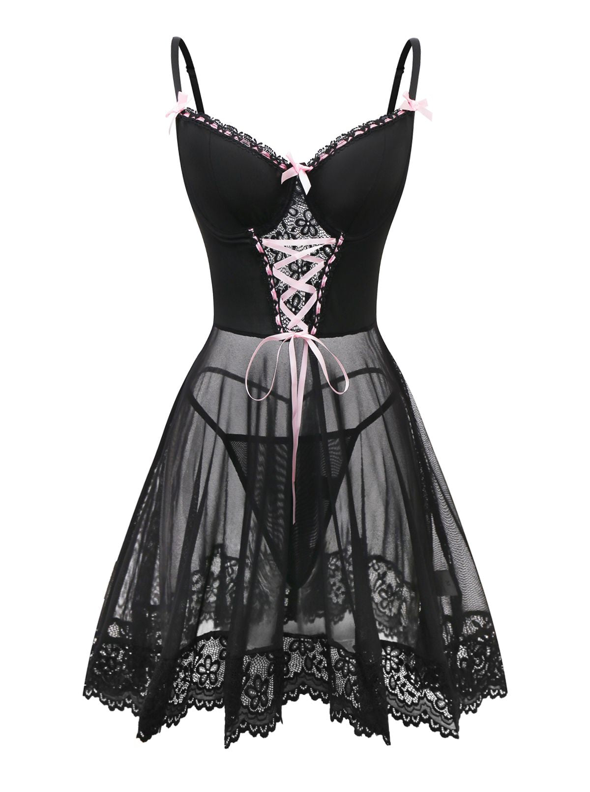 Black 1950s Spaghetti Strap Bow Lace Sleepwear