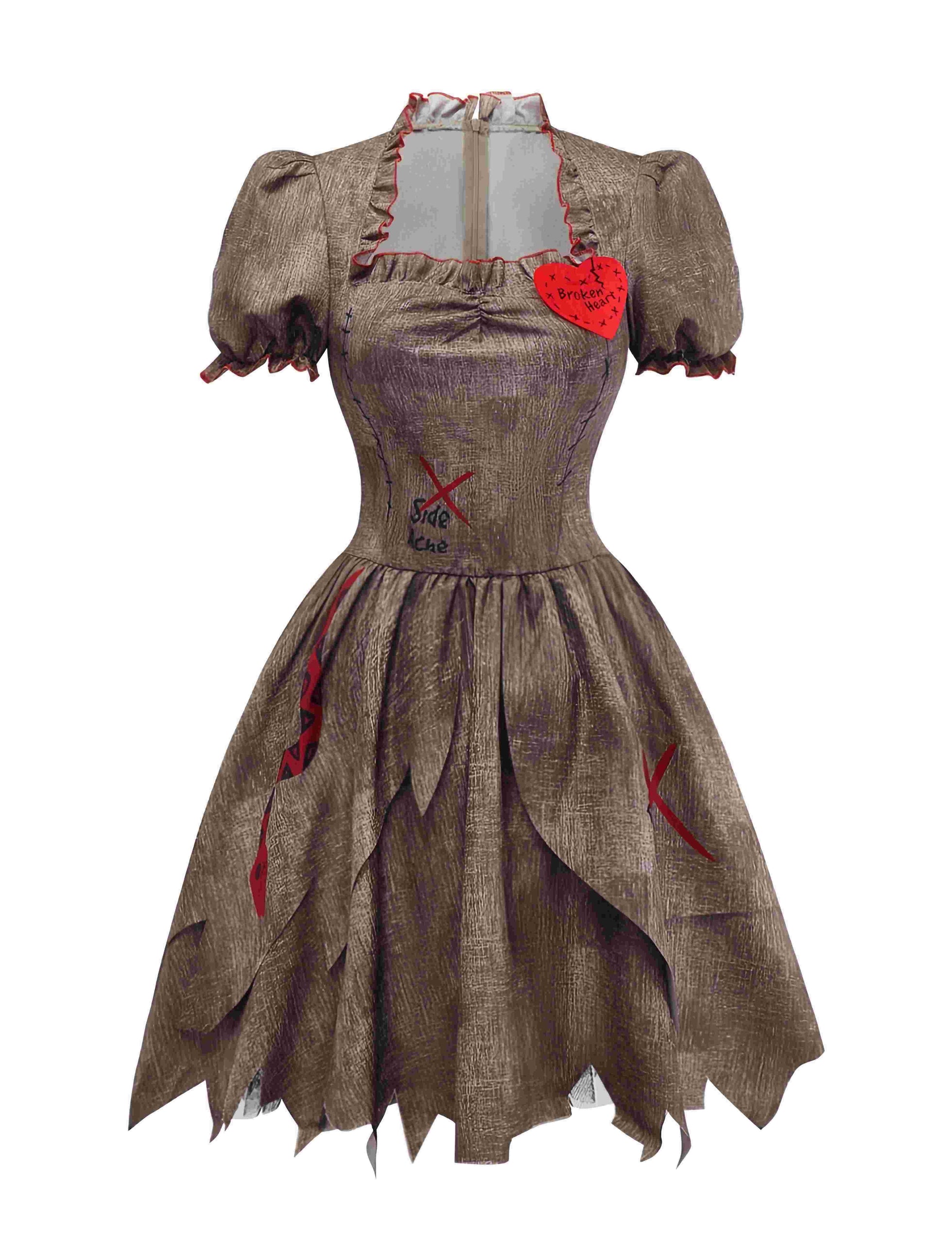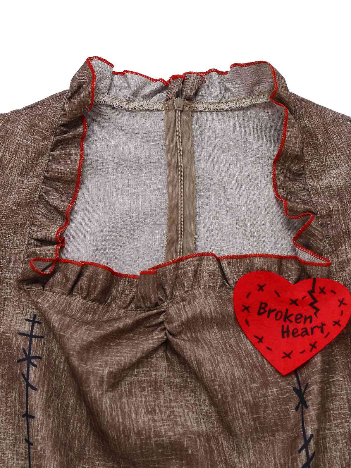 Brown 1960s Halloween Heart Patch Evil Doll Tattered Dress