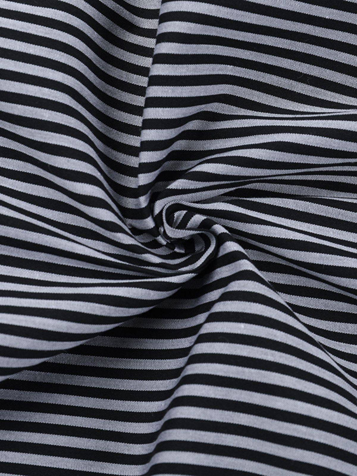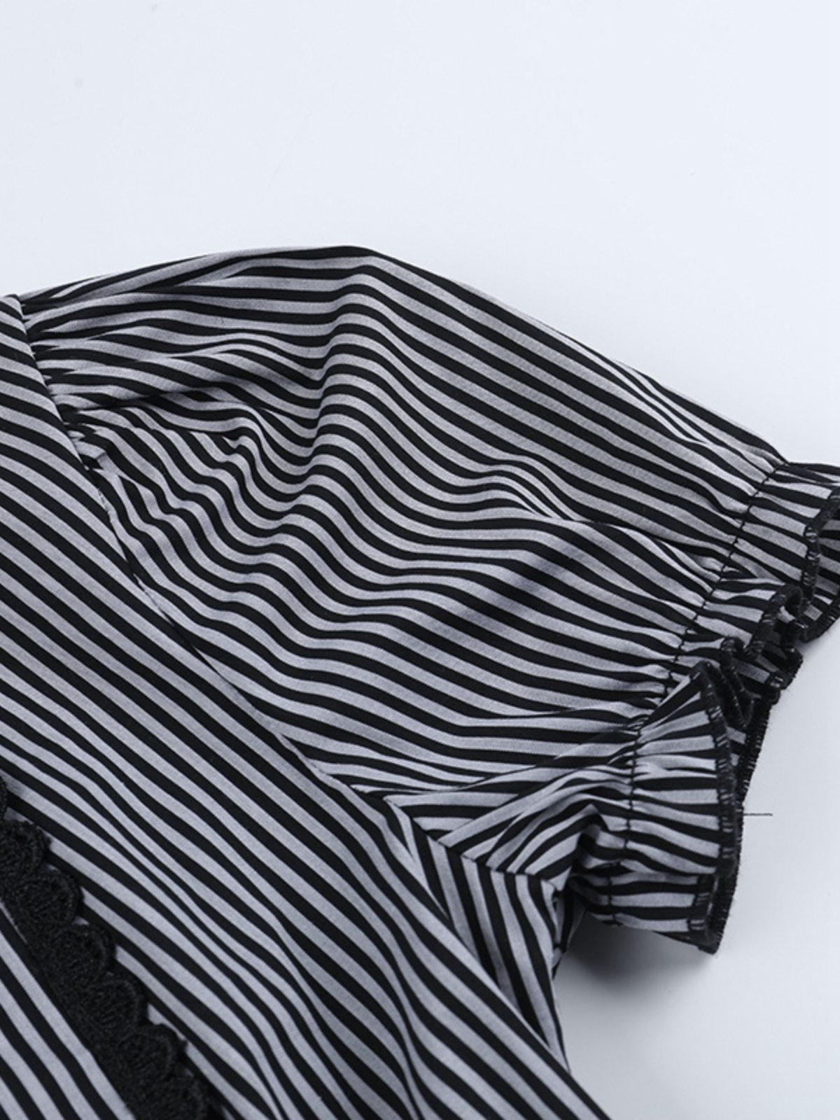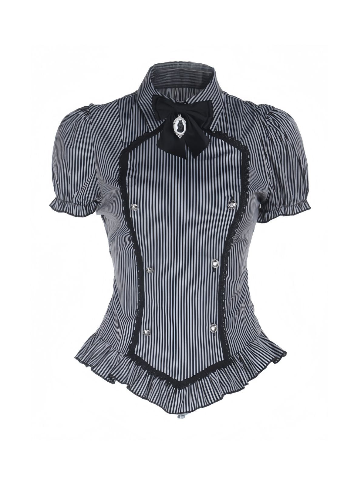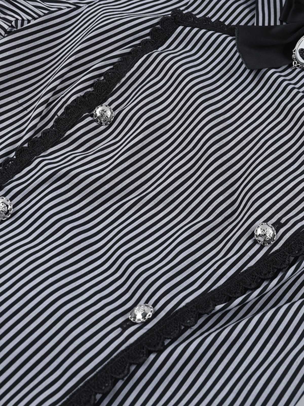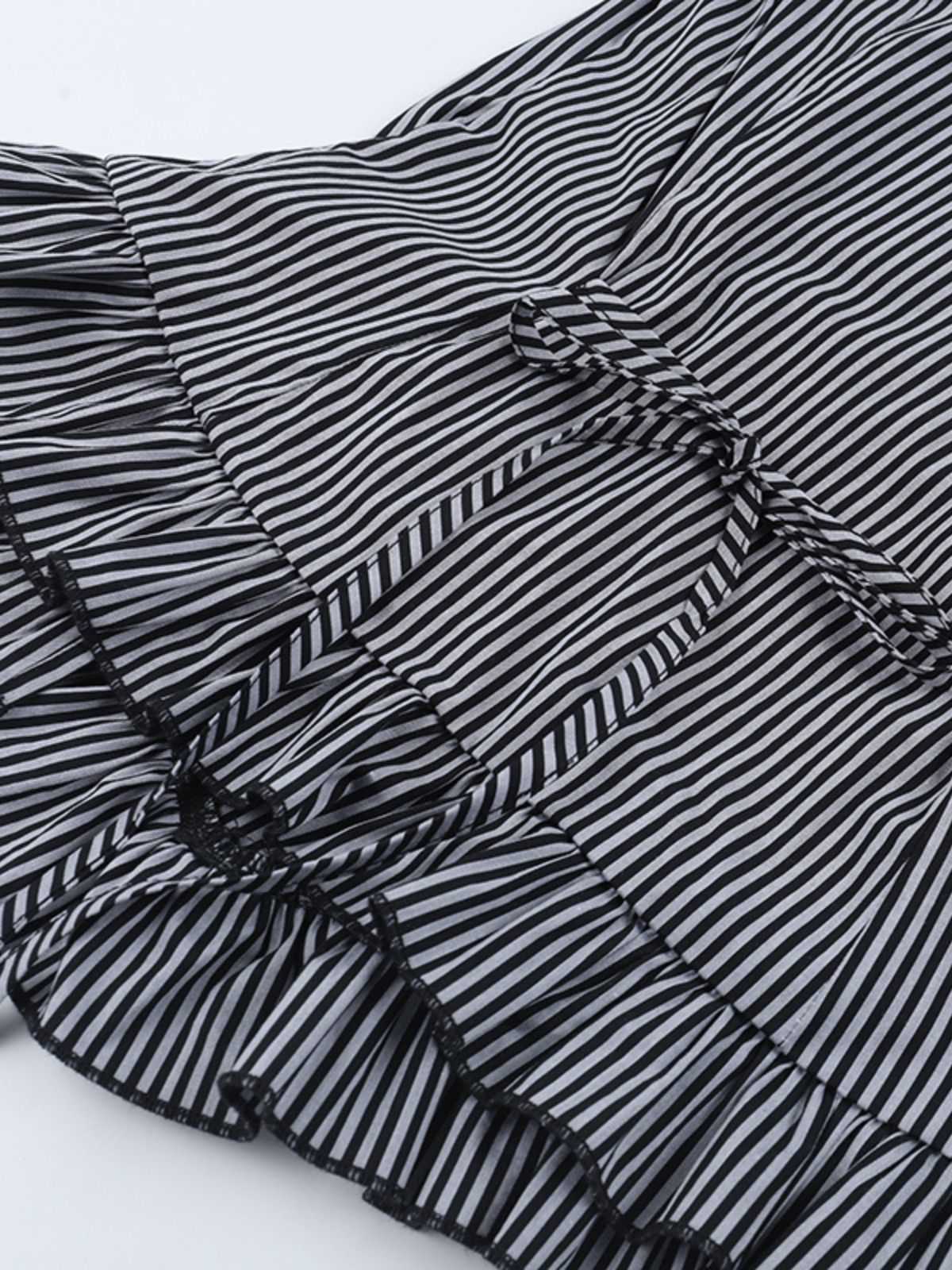 Gray 1930s Vertical Striped Puff Sleeve Ruffled Blouse