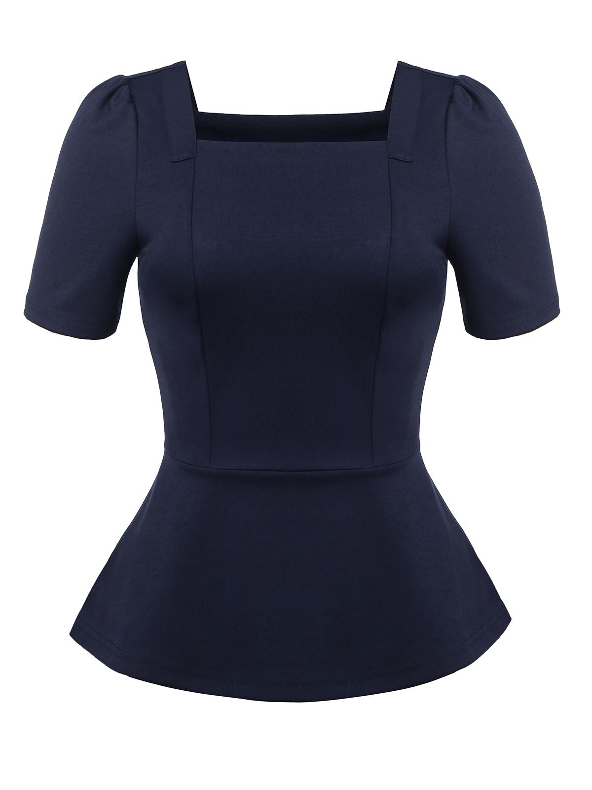 Bring them to their knees, dames! A gathered square neckline, trim and tailored short sleeve and a natural waistline create an elegant and darling silhouette. A sure conversation starter, the adorable Navy Blue Square Neck Solid Top is utterly unique and entirely kitsch!