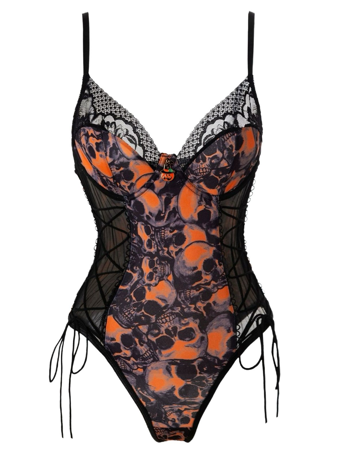 Orange 1970s Skull Lace Spaghetti Strap Bodysuit