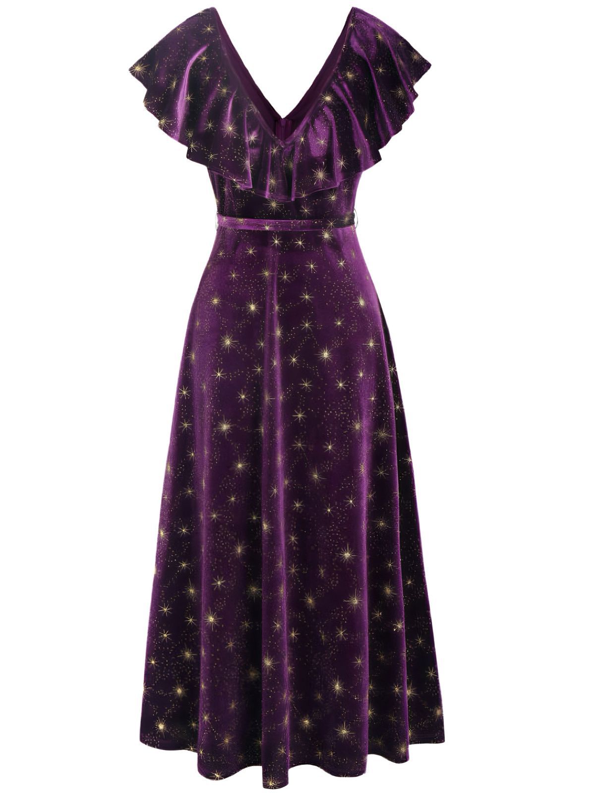 [Pre-Sale] Purple 1940s Velvet V-Neck Star Ruffle Dress