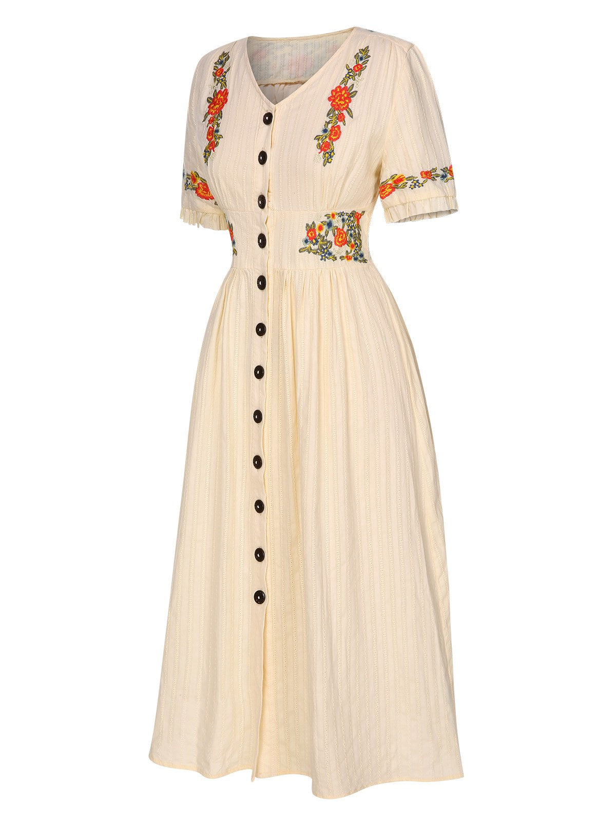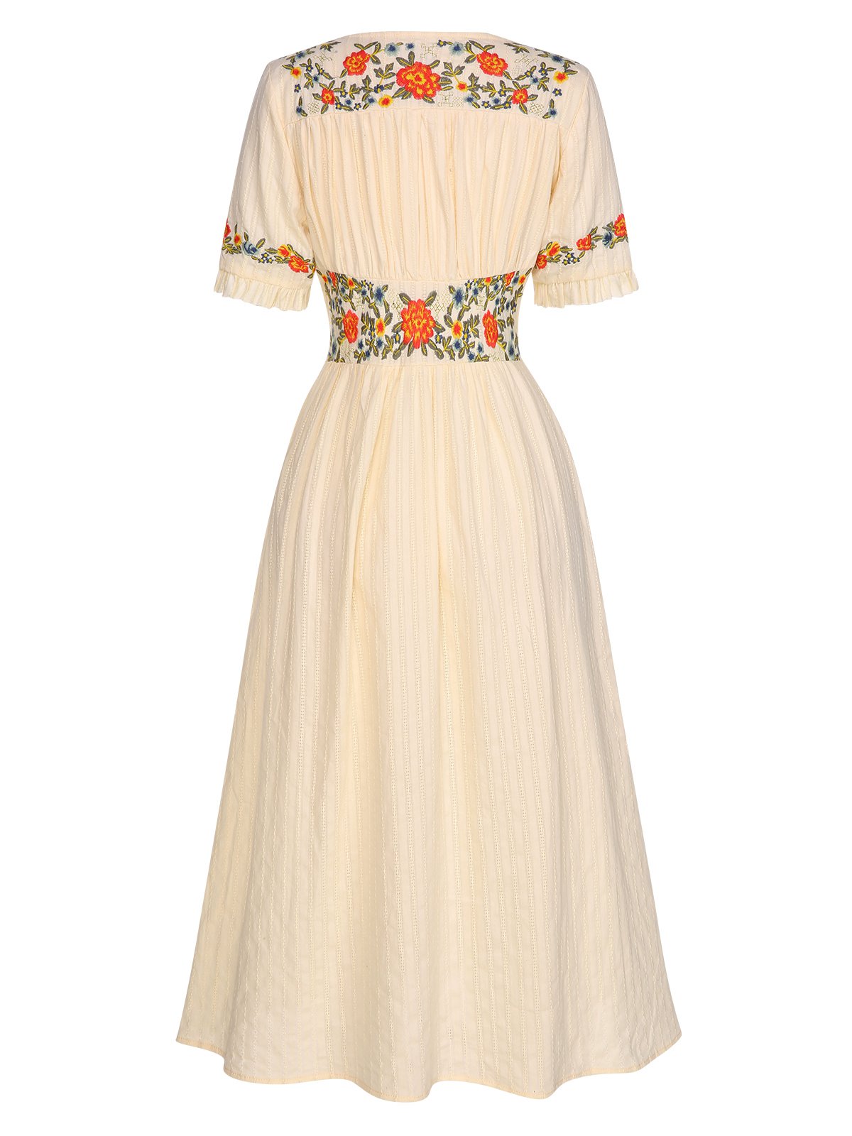 Capture the warmth of autumn with this embroidered vintage-inspired dress. The soft cream fabric, adorned with delicate floral details, evokes the coziness of fall festivals and crisp days. Perfect for harvest celebrations or a relaxed weekend outing, this timeless design adds a touch of rustic charm to your seasonal wardrobe.