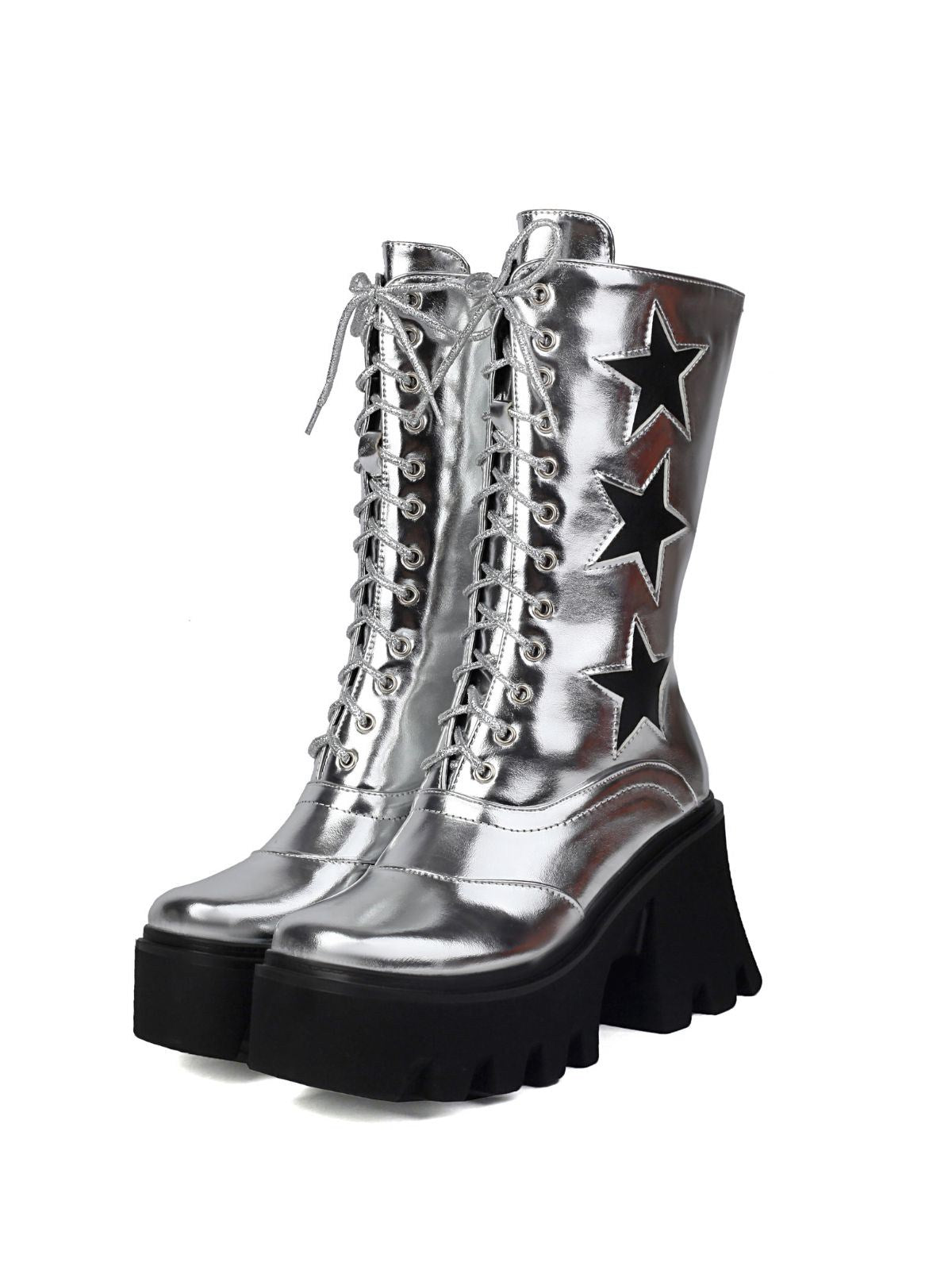 Vintage Steampunk Star Print Platform Mid-Calf Boots