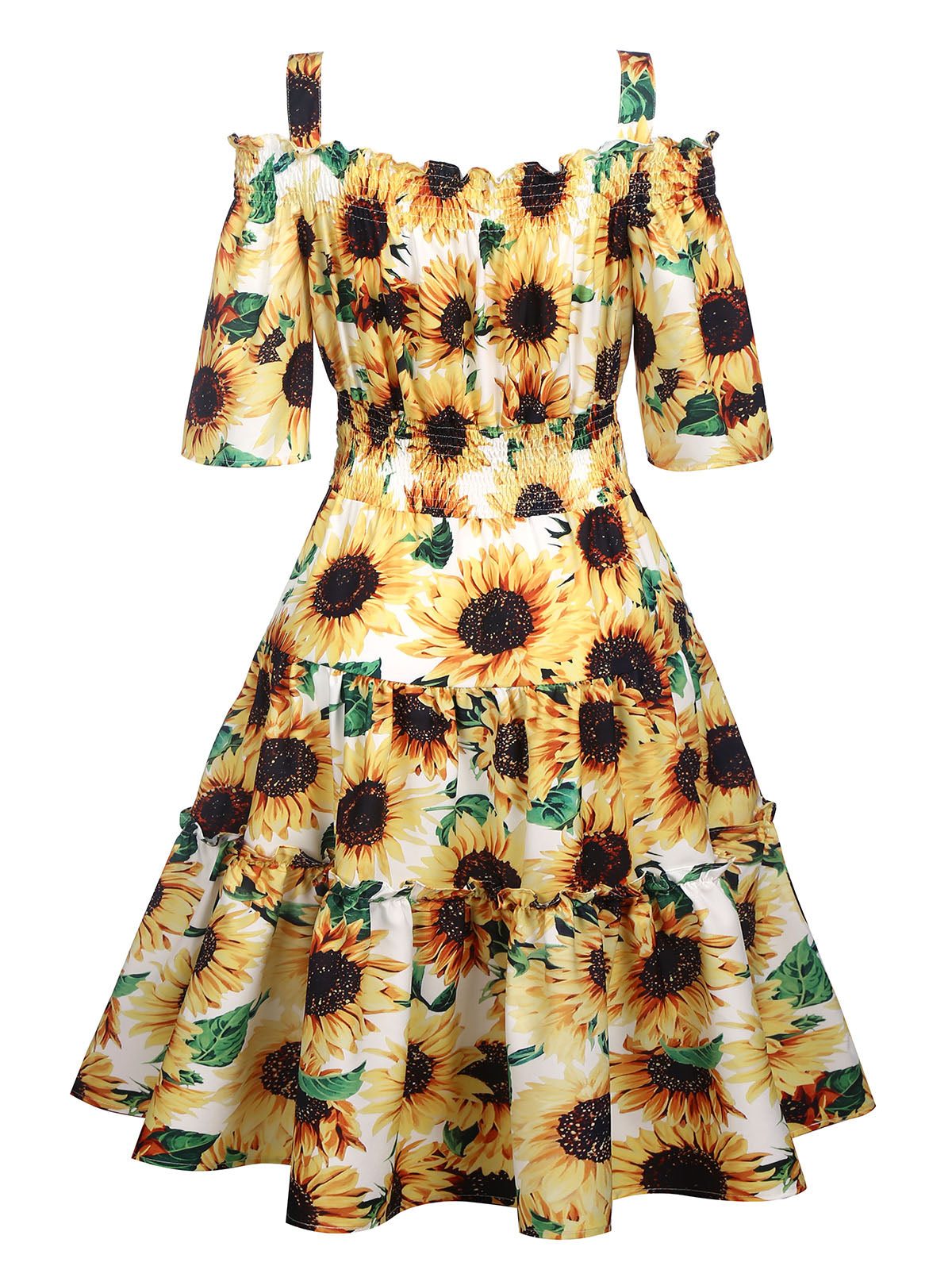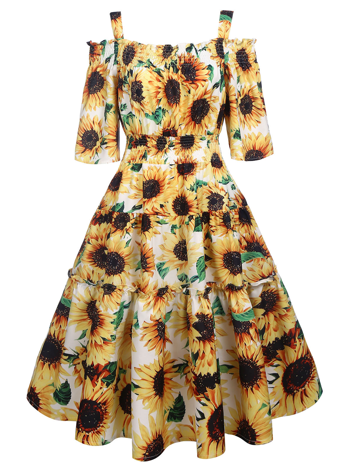 The secret ingredient is sunflowers, dears! This exquisite sunflower 1950s dress is cut to perfection, with a tailored bodice that nips in at the waist to show off your killer curves, and a full, flared skirt that flatters all figures. Retro charm meets summer style, with this sensational retro dress by RetroStage.